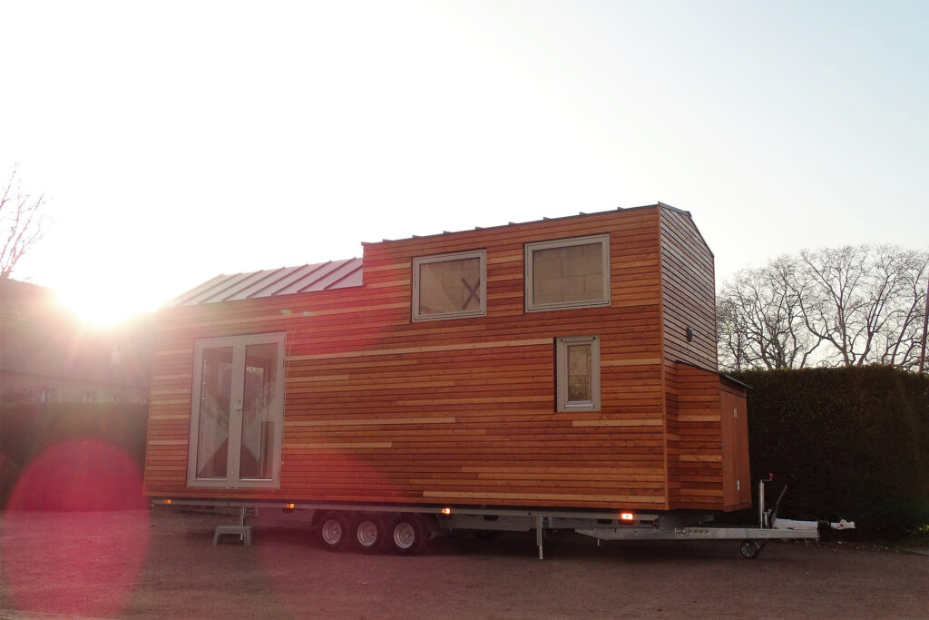 Ein 7,2m AL-KO Trailer ist die Basis für dieses Tiny House. Mit einer Grundfläche von ~18m² und zusätzlichen 8m² Loftbereich (zweite Ebene) ist es gar nicht so tiny. Entsprechend der Straßenverkehrsordnung ist es genau 2,55m breit und 4m hoch. Besonders herausfordernd war es im Rahmen des zulässigen Gesamtgewichts von 3,5t zu bleiben. Die Bodenplatte ist eine Materialkombination von Siebdruckplatte, Konstruktionsvollholz (KVH) und OSB-Platten. Die Bodendämmung ist ein wasserbeständiger Extruderschaum.