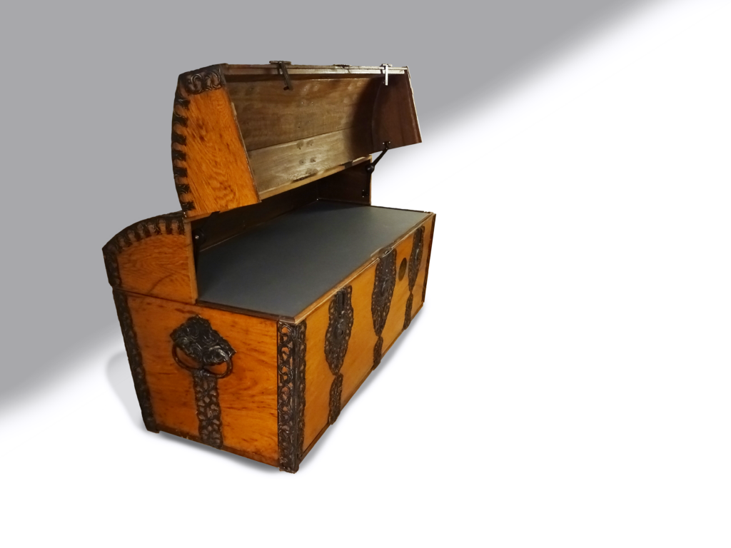 Von einer Kundin habe ich das alte Erbstück der Familie anvertraut bekommen. Eine so genannte Aussteuertruhe mit aufwändigen Metallbeschlägen. Diese Truhe hatte lange Zeit auf einem Speicher verbacht und da Truhen im Alltag nicht  die praktischsten Möbelstücke sind, sollte dieses Stück radikal umgebaut werden. Dies bedeutete, dass der Deckel halbiert und aufstellbar wurde, es nun einen linoleumbelegter Zwischenboden gibt und zwei große Schubkästen die Truhe bedienbarer machen.