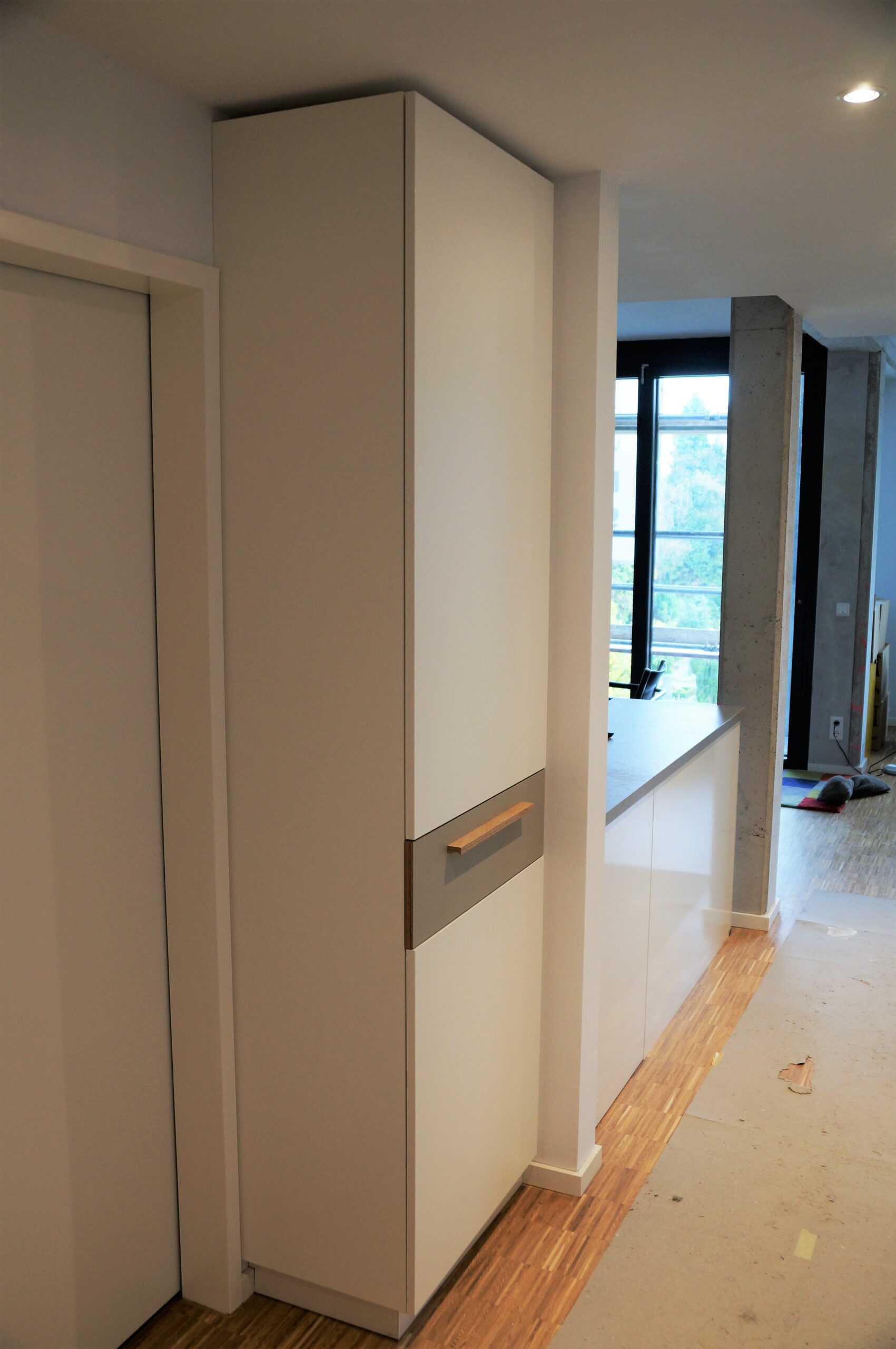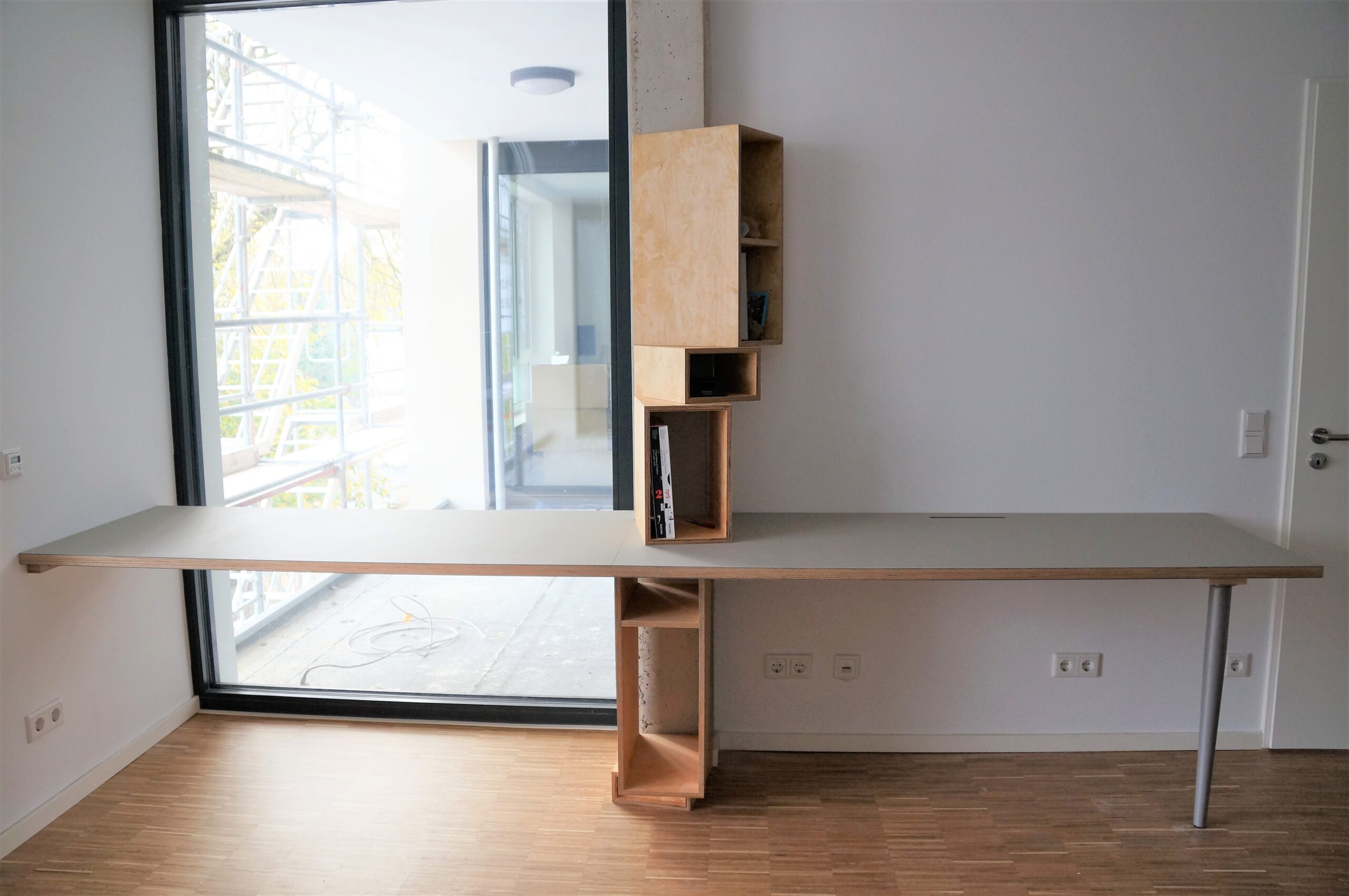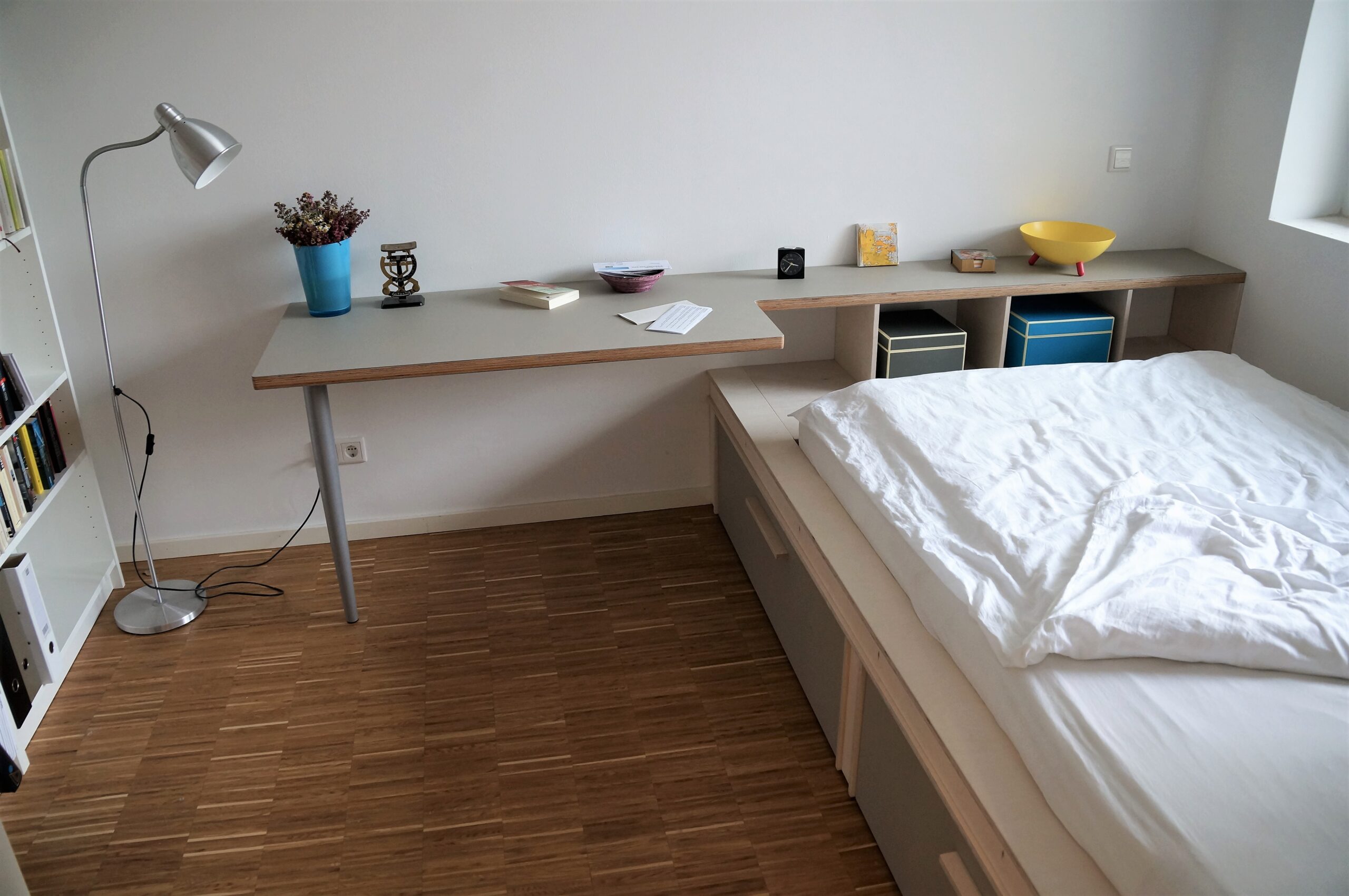 Für die neu gebaute Wohnung zweier Kunden baute ich einige unterschiedliche Möbel: einen großen Schreibtisch mit Linoleumoberfläche, mit offenen Regalfächern, die sich um eine Betonsäule drehen. Einen Garderobenschrank mit Schubkasten aus weißem Plattenwerkstoff und einer besonderen Linoleumfront. Und eine Bett-Schreibtischkombination aus weiß geöltem Birkensperrholz und Linoleumoberflächen.