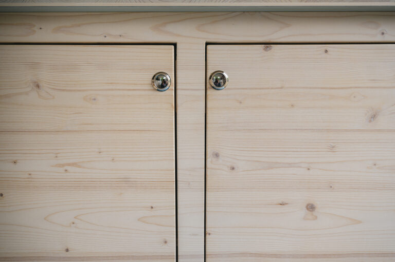 Die Außenverkleidung ist ebenfalls in Fichte ausgeführt. Hier haben wir Profilbretter in Rhombusleistenoptik gewählt und diese in unterschiedlichen Farben lasiert. Das Dach besteht aus leichten Alustehfalzblechen. Für den Innenausbau, also die gesamte Küche und den Treppenschrank, haben wir vornehmlich leichte Tischlerplatten aus Fichte/Gabun verwendet, die von Hand lackiert wurden.