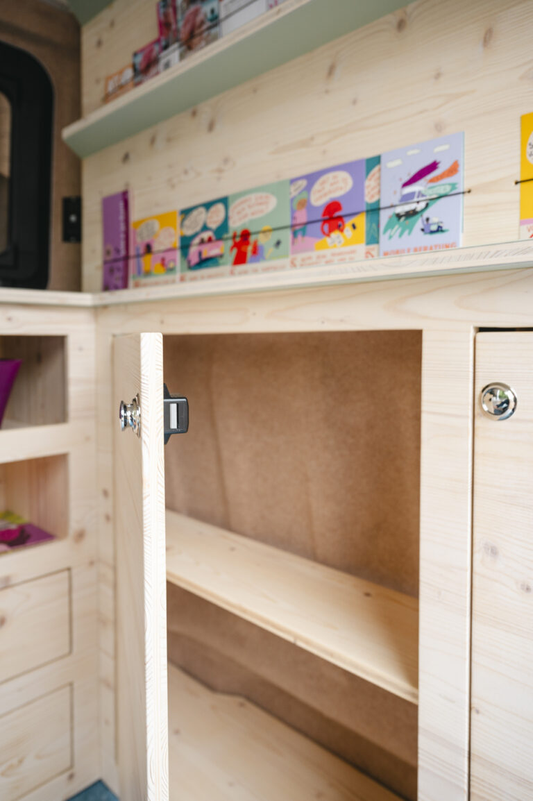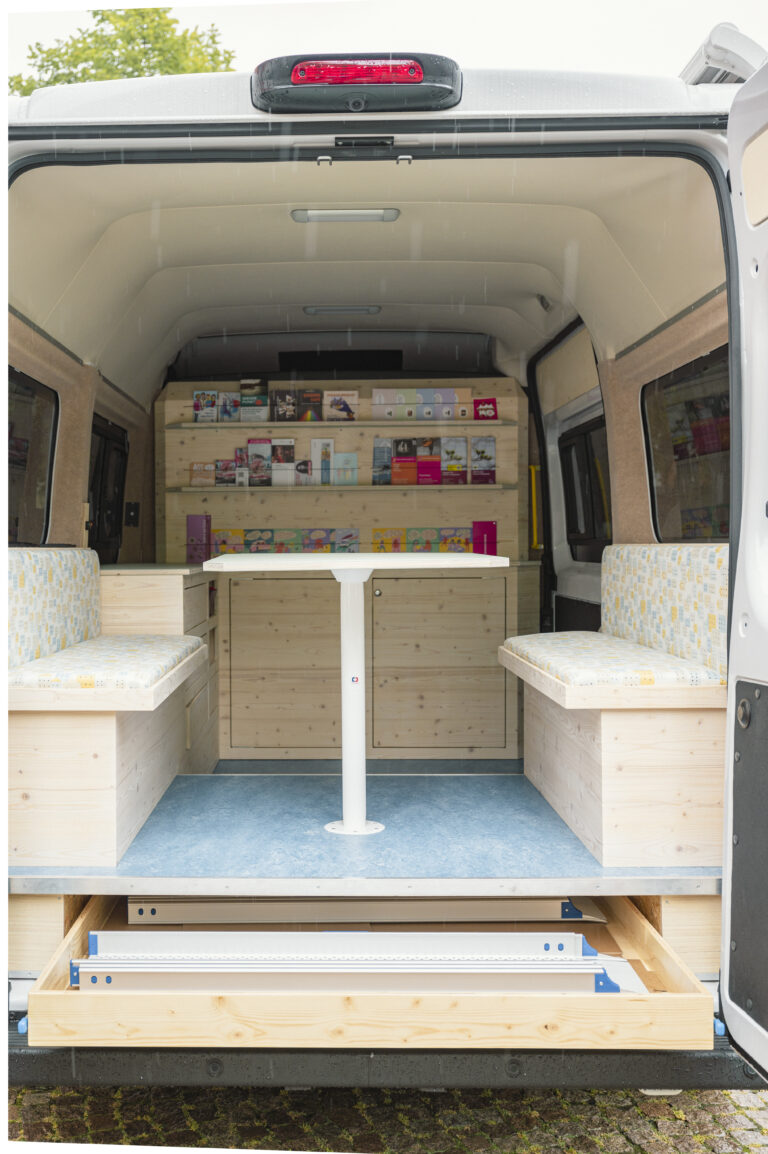 Diesen Beratungsbus habe ich nach den Wünschen der Beraterinnen entworfen und ausgebaut. Die nackten Metallwände mit einem Filz bezogen, eine druchgehende Bodenplatte verbaut und mit Linoleumboden belegt. Zwei Sitzbänke und ein Tisch für Beratungsgespräche, sowie Schränke mit Schubkästen und Türen. Außerdem eine Ausstellungswand für Broschüren und Infomaterial, die mit Gummizügen auch während der Fahrt gehalten werden. Unter der Sitzecke ist ein großformatiger Vollauszug mit viel Platz für Standmaterial.