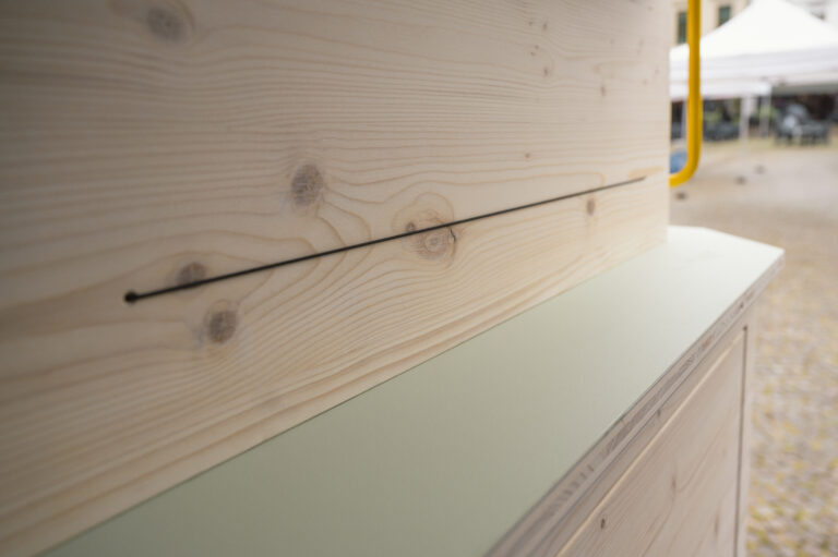 Sämtliche Möbel sind aus Dreischichtplatte gefertigt, Oberflächen mit Linoleum belegt. Ich durfte also wieder einmal mit meinen Lieblingsmaterialien arbeiten, die mich in Sachen Nachhaltigkeit, Design und Kostenaufwand immer wieder begeistern.