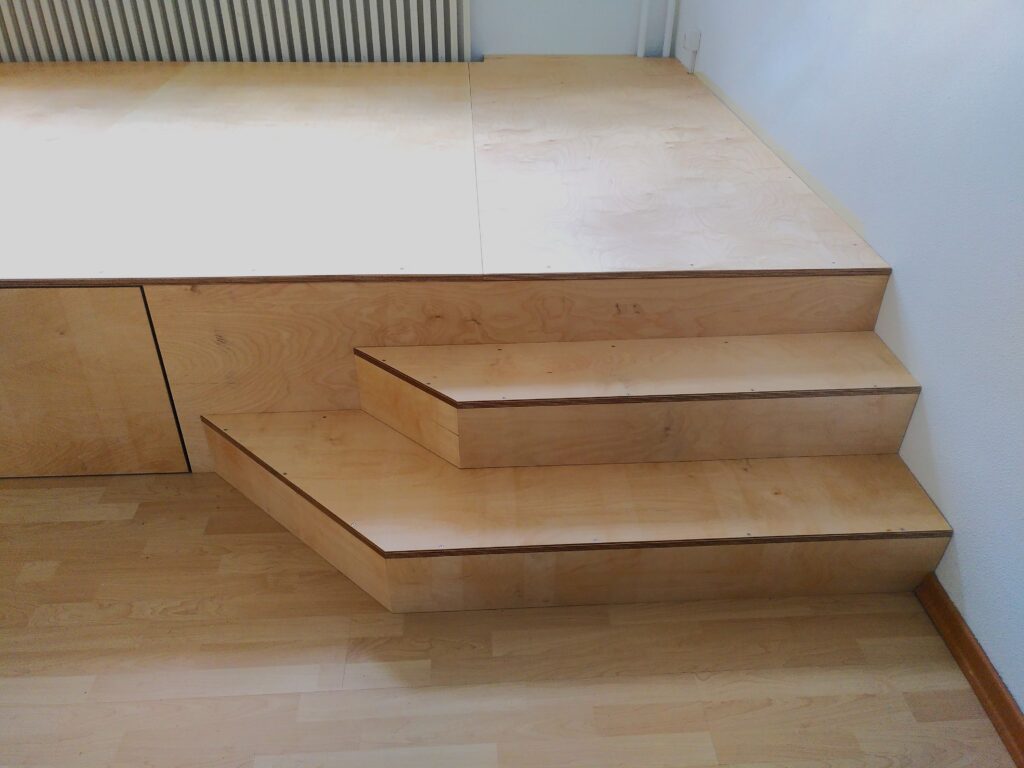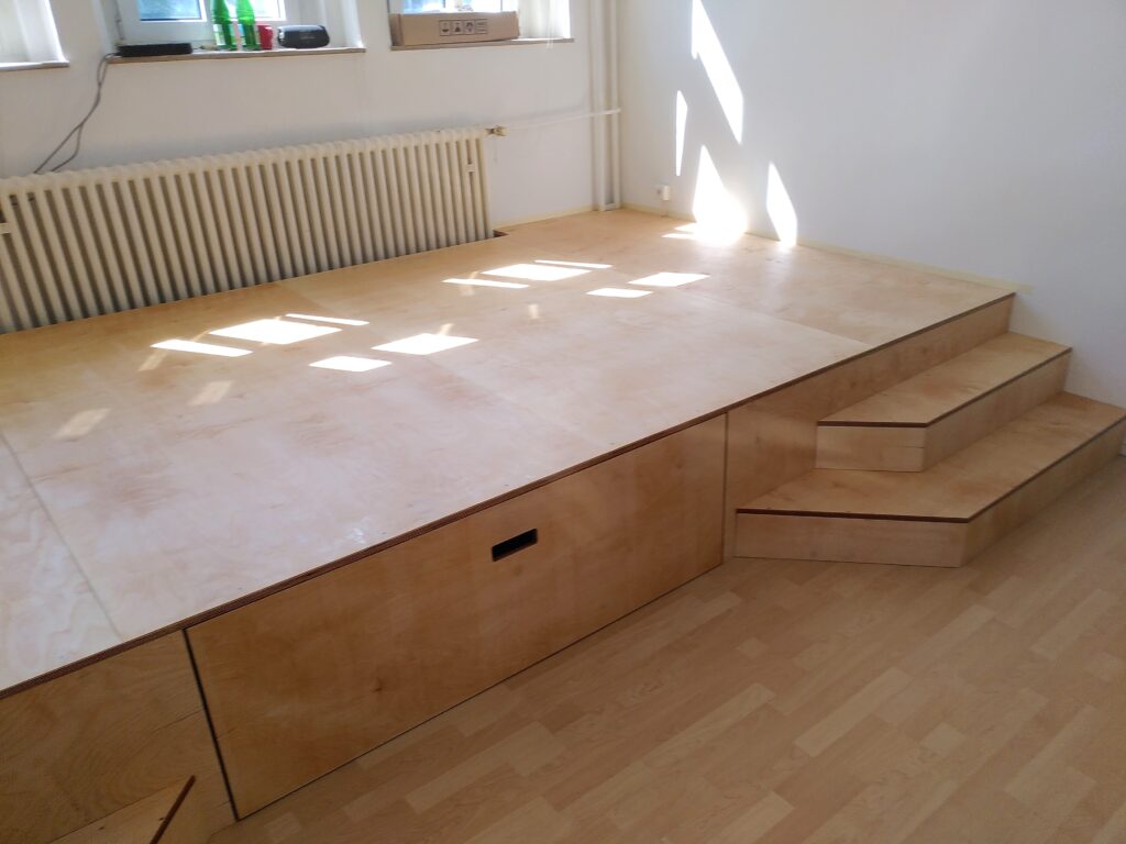 Nachdem ich 2021 bereits den Seminarraum für das Kölner Flüchtlingszentrum Fliehkraft ausgebaut habe wurde ich angefragt ein weiteres, kleineres Podest in einen neu angemieteten Büroraum zu bauen. Der Grund: Die Fenster dieses Büroraums liegen extrem hoch und ohne Podest hatte man das Gefühl in einem Schacht zu stehen. Das Podest lockert den Raum auf und erhöht die Arbeistplätze auf ein „normales“ Fensterniveau.