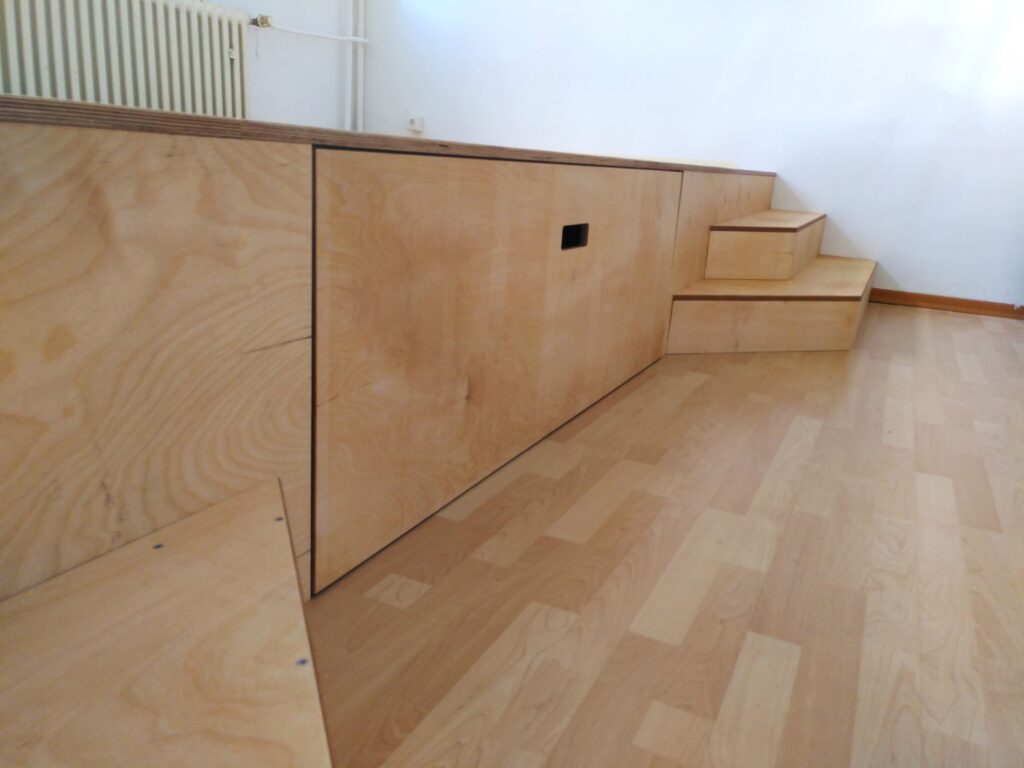 Es konnte eine Stiftung für die Idee gewonnen werden und ich habe entsprechende Entwürfe und Workshopformate vorbereitet. Im Projektverlauf haben wir den gesamten Eingangs- und Seminarbereich renoviert. Außerdem wurde dem Auftrag entsprechend ein großes Podest, diverse Sitzkisten und Bilderrahmen gebaut. Als Material wurde Birkensperrholz verwendet, die Sitzflächen selbst gepolstert.