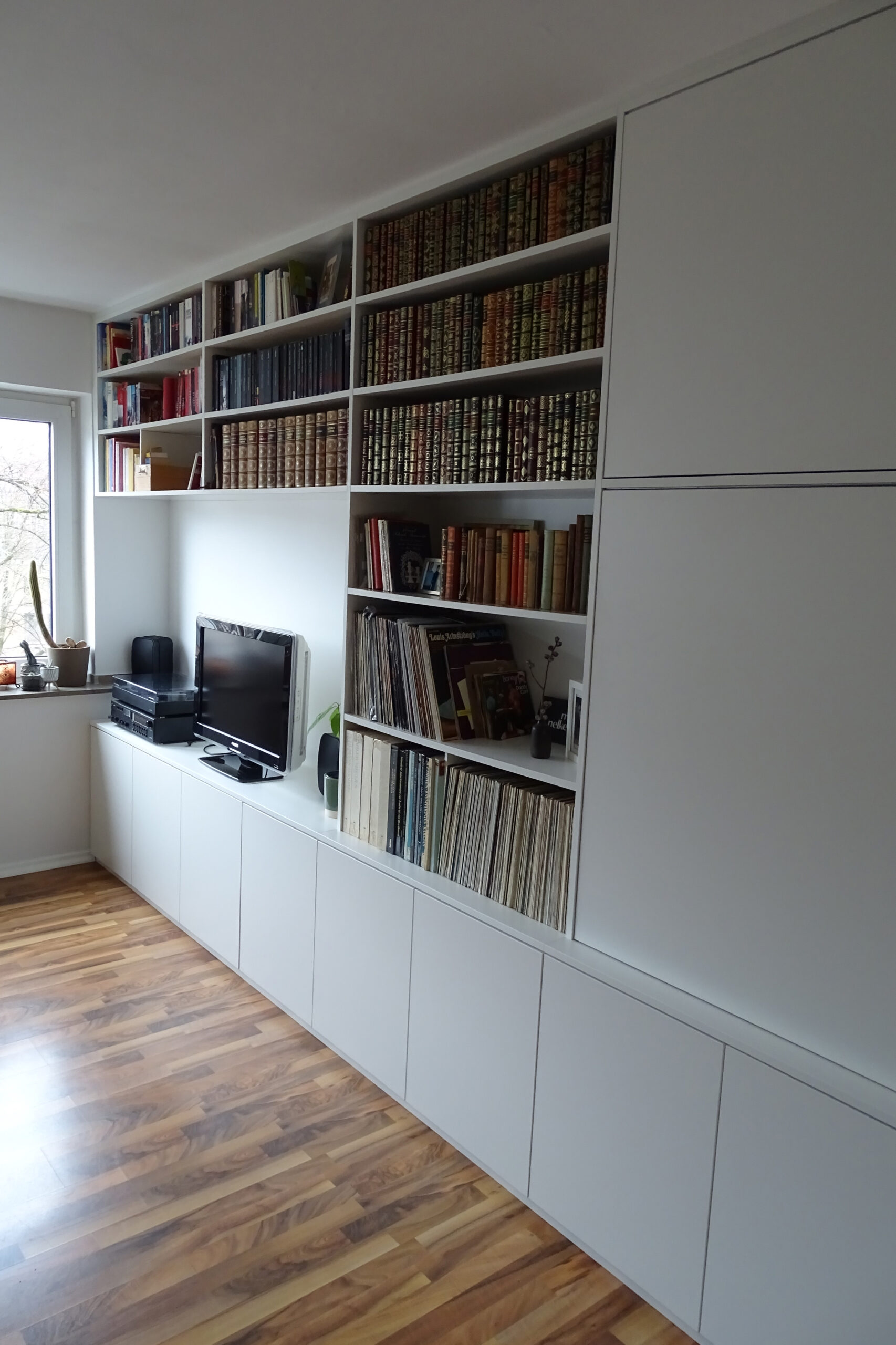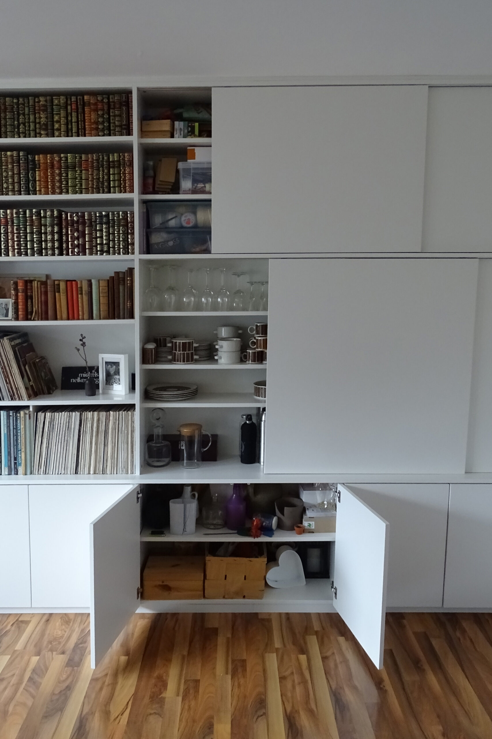 Aufwändiger Einbauschrank aus weißem Plattenmaterial mit verschiedenen Dreh- und Schiebtüren.