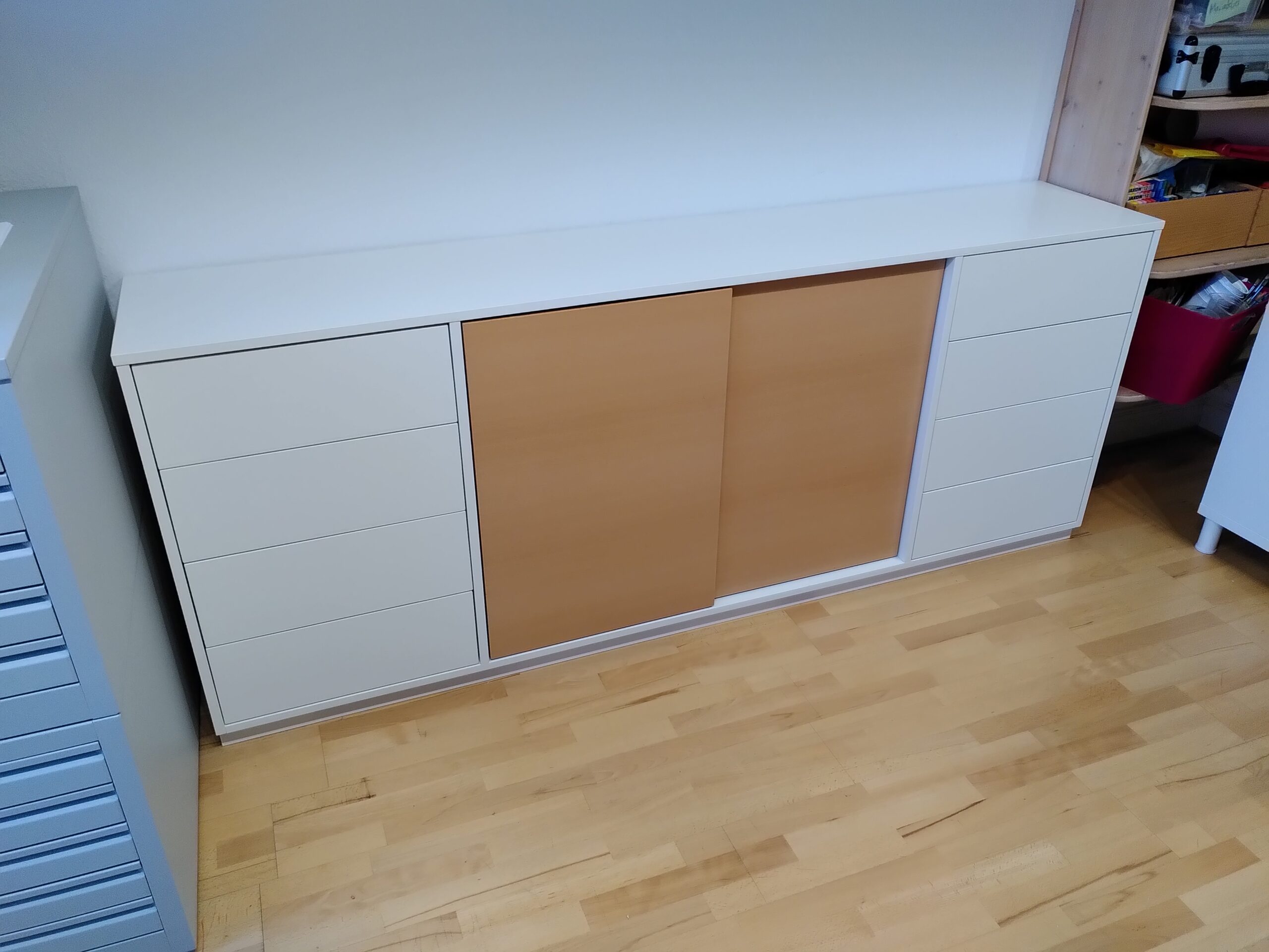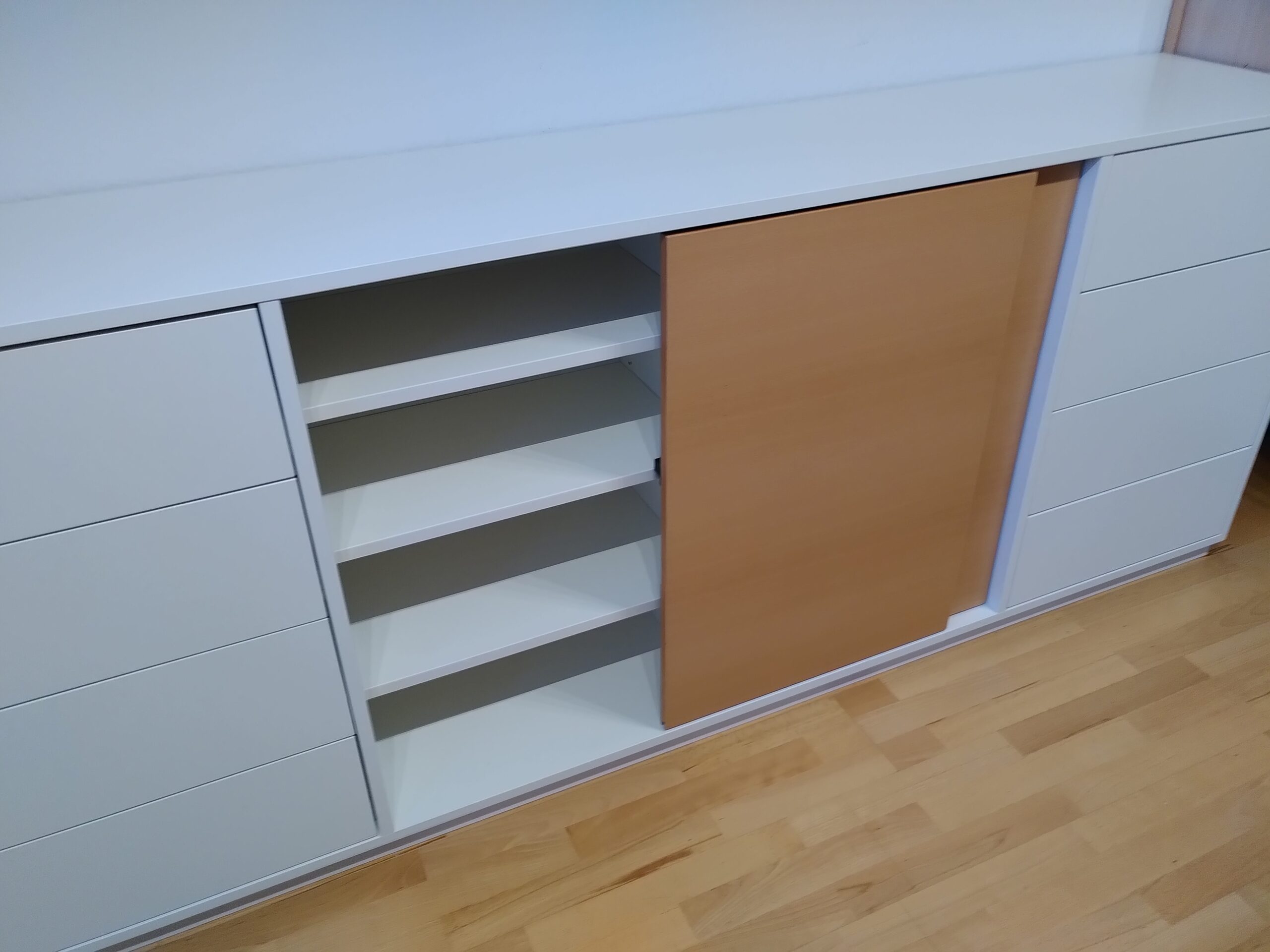 Um den bestehenden Schrank aufzuwerten habe ich ein Schrankelement entfernt und durch einen hochwertigen Einsatz in Eichenfurnier (matt lackiert) ersetzt.