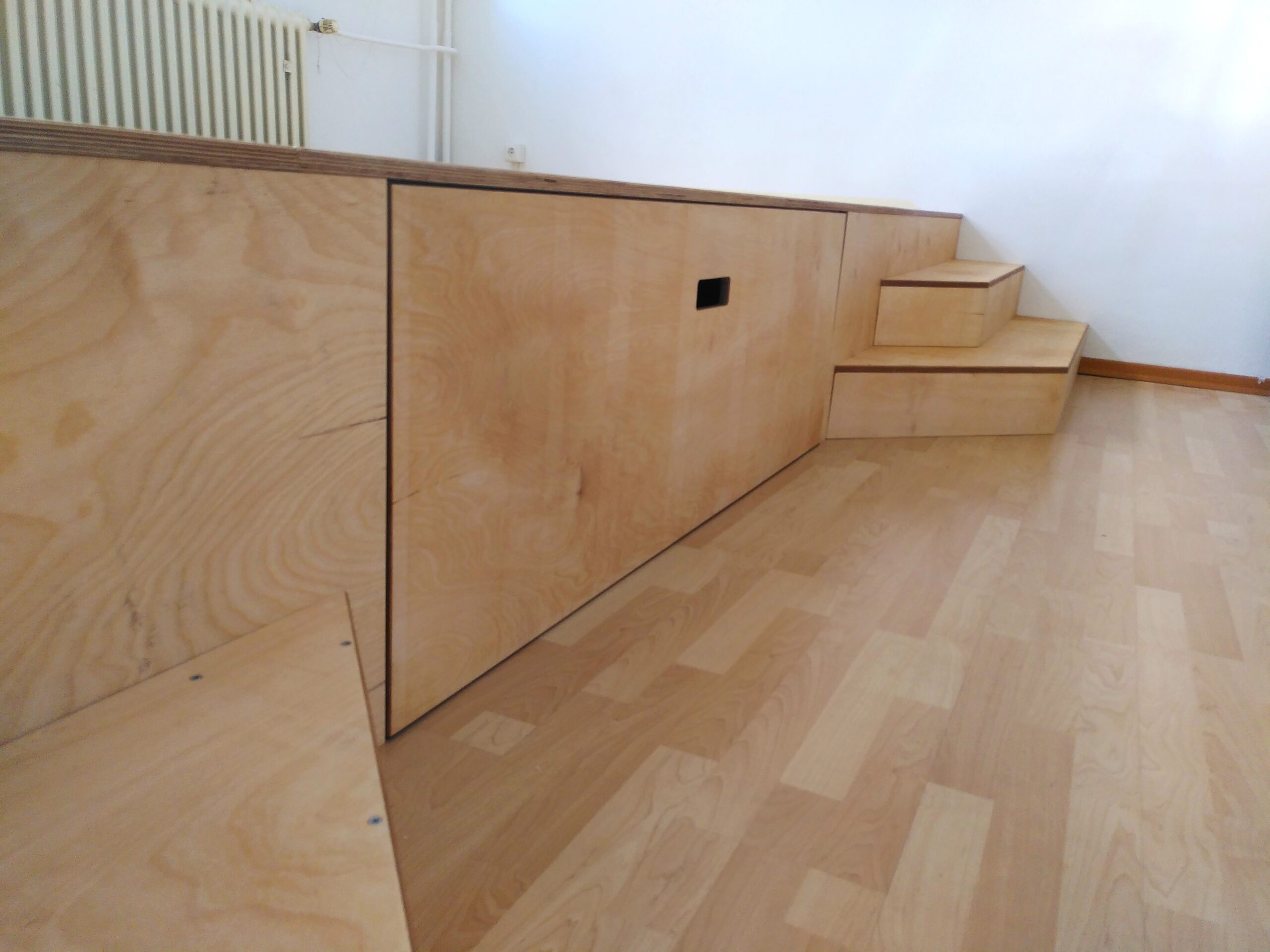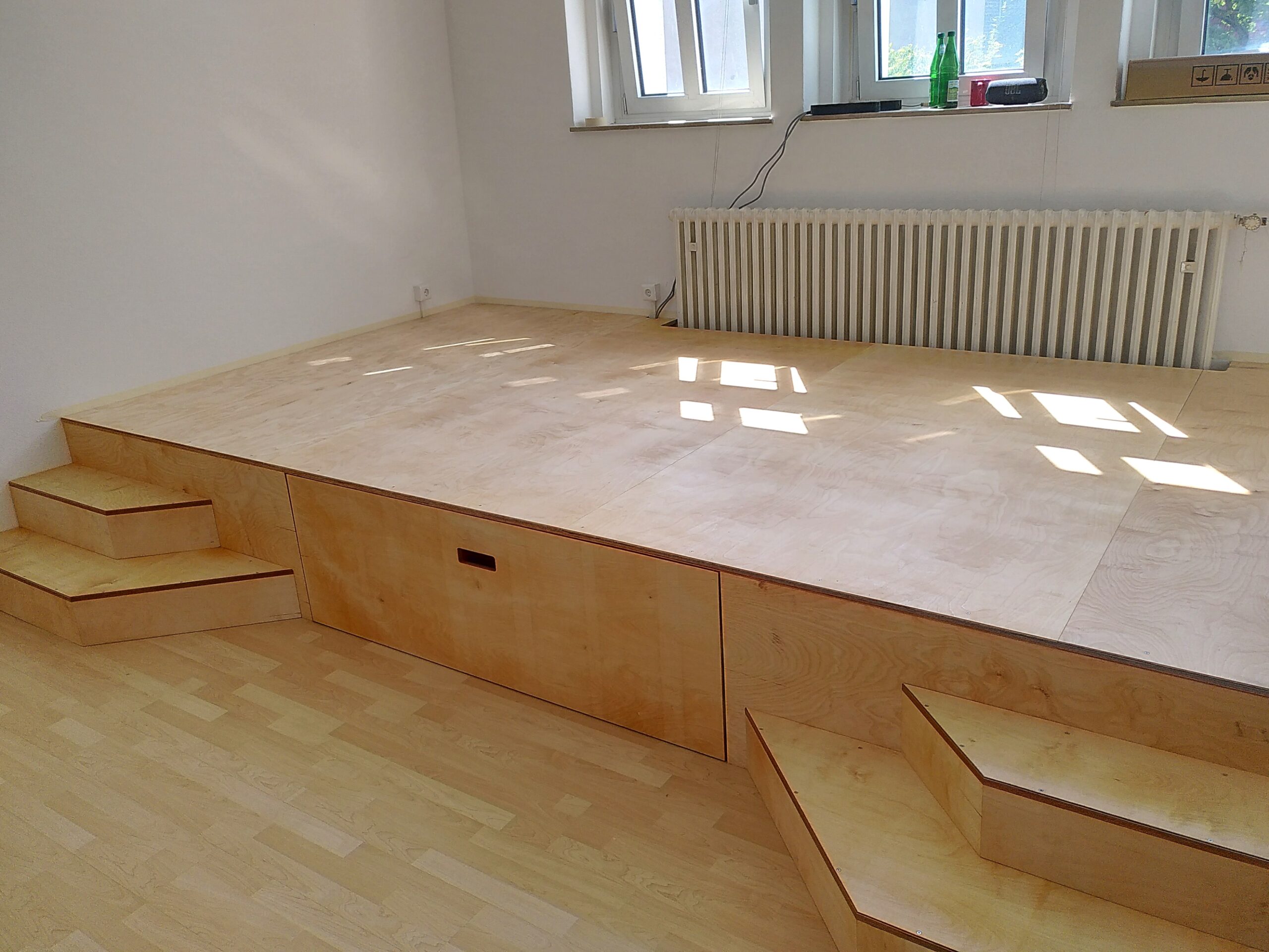 Nachdem ich 2021 bereits den Seminarraum für das Kölner Flüchtlingszentrum Fliehkraft ausgebaut habe wurde ich angefragt ein weiteres, kleineres Podest in einen neu angemieteten Büroraum zu bauen. Der Grund: Die Fenster dieses Büroraums liegen extrem hoch und ohne Podest hatte man das Gefühl in einem Schacht zu stehen. Das Podest lockert den Raum auf und erhöht die Arbeistplätze auf ein „normales“ Fensterniveau.